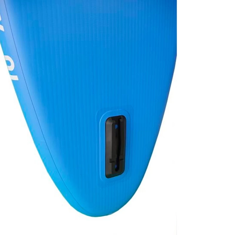 L’équipement est très complet avec des tendeurs élastiques pour accrocher du matériel, une poignée de portage (centrale), une poignée avant et une poignée arrière. Sur le pont, un pad de qualité assure un confort et un grip efficaces et sur la carène l’aileron central démontable assure un bon guidage de la planche.